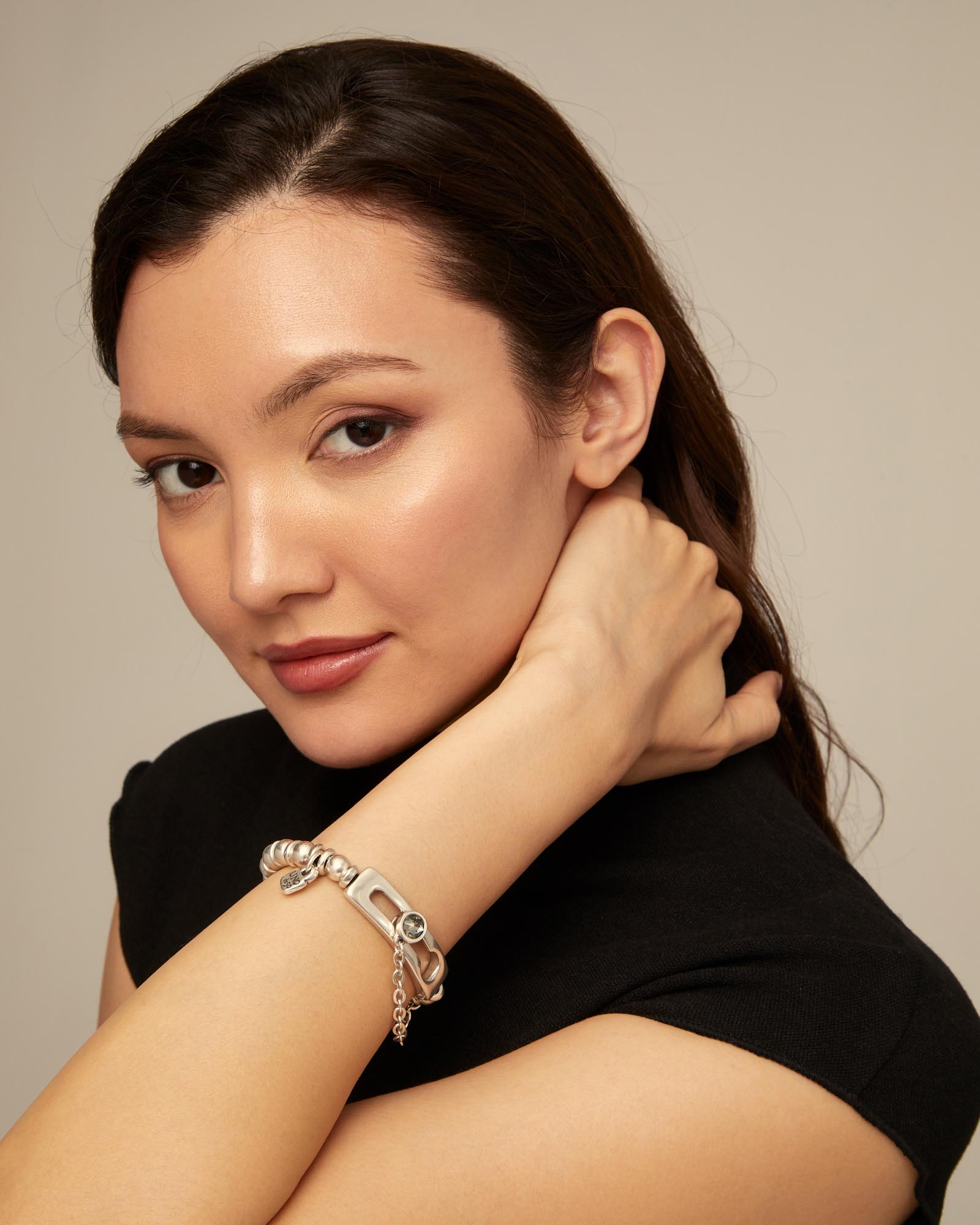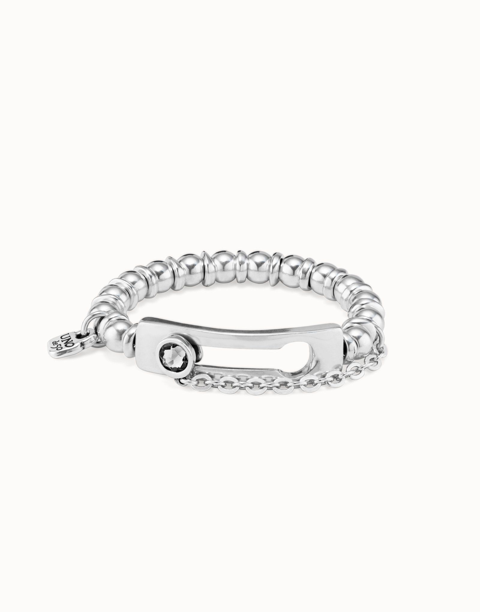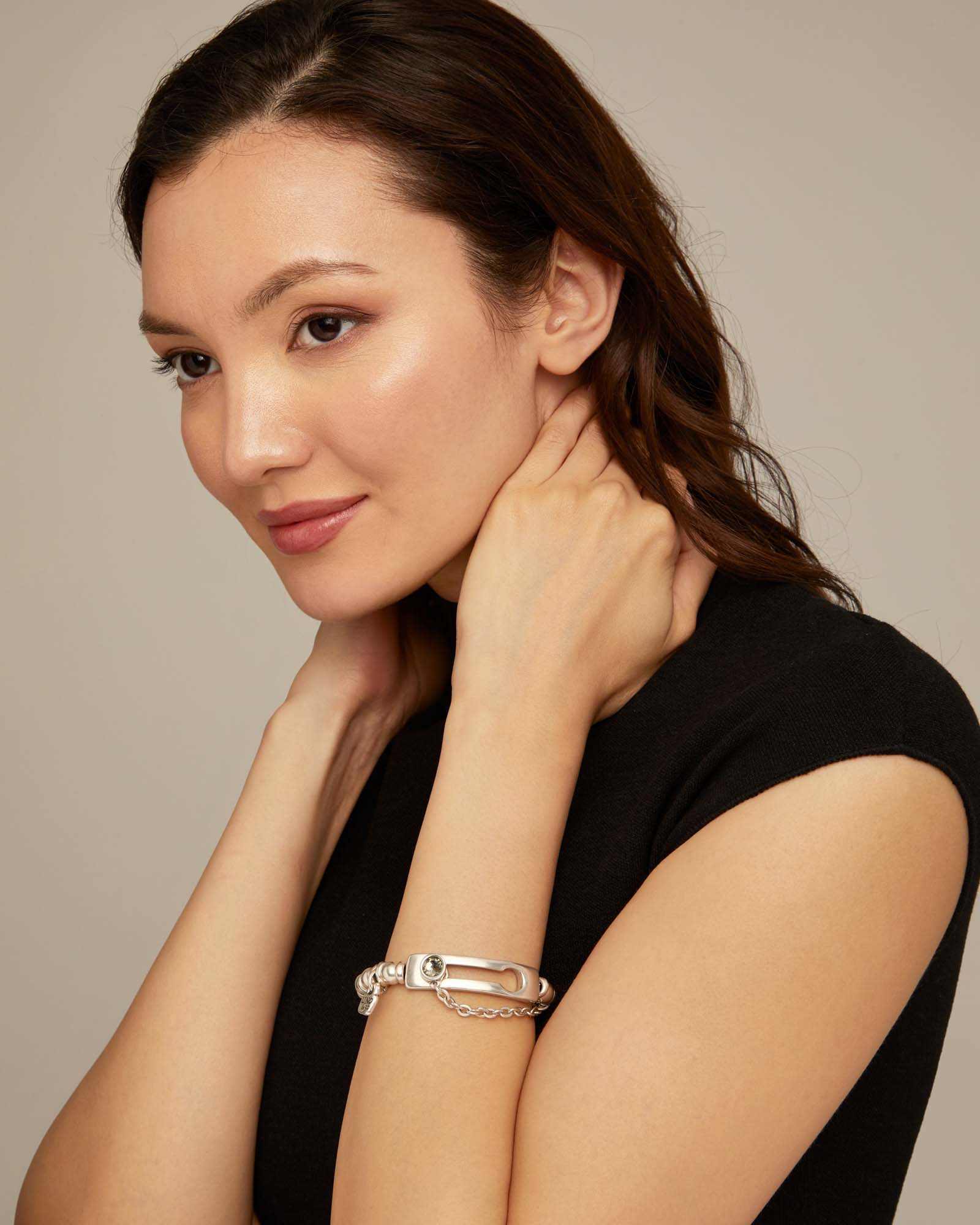 Pulsera tipo brazalete de cómoda apertura con original diseño de una gran pieza central rectangular con un cristal gris facetado y una cadena de seguridad.