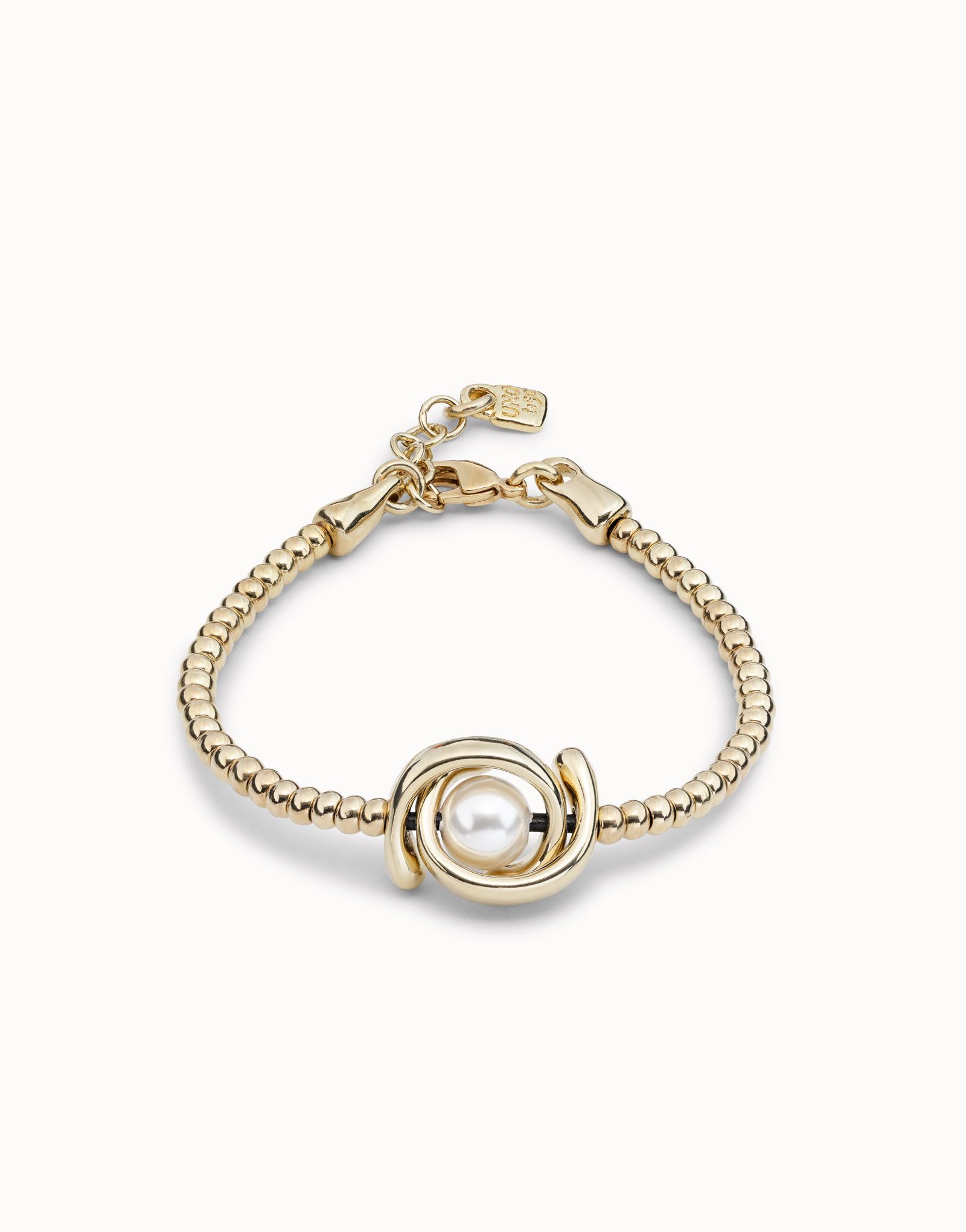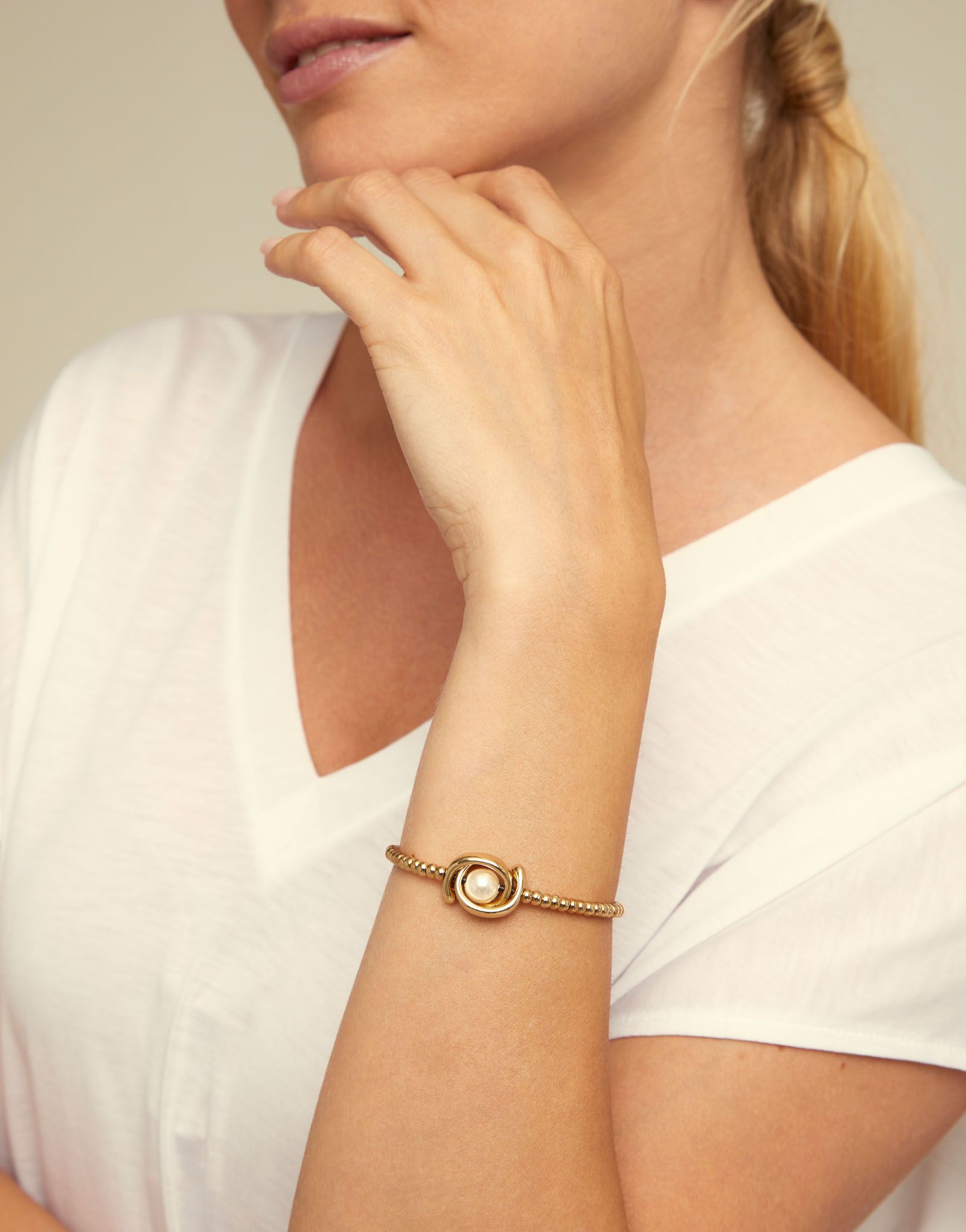 La pulsera Little Moon es un diseño elástico de una vuelta. Sostiene un abalorio de doble luna y una perla central. Está elaborada en España artesanalmente, utilizando una aleación única de metales bañados en oro. Su cierre de mosquetón permite ajustar la pieza a la medida deseada. Consigue esta joya y lúcela en cualquier ocasión.