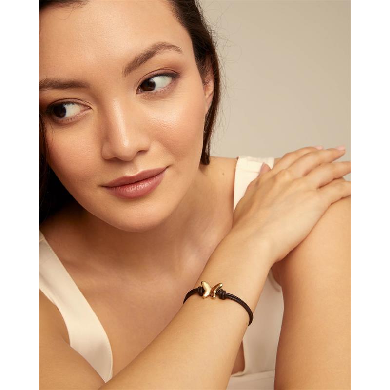Pulsera UNOde50 para mujer modelo Volare de la colección Free fabricada en doble tira de cuero negro con un abalorio central en forma de mariposa fabricada en aleación de metales bañados en oro amarillo. Su cierre es de botón.