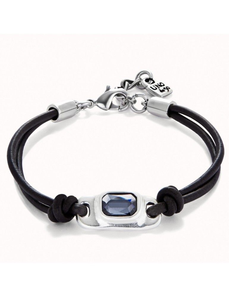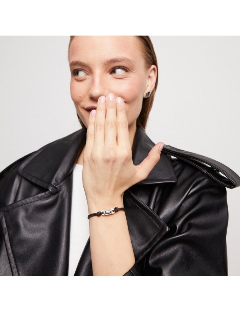 Pulsera de cuero negro bañada en plata de ley con cristal facetado central gris. Elaborado en España, en un proceso 100% artesanal. Estas joyas son una exposición de arte compuesta por pulseras, anillos, collares y pendientes donde cada joya es una obra de arte en la que encontramos cristales tallados estilo esmeralda y piezas con capas de formas geométricas. Descubre ser magnética.