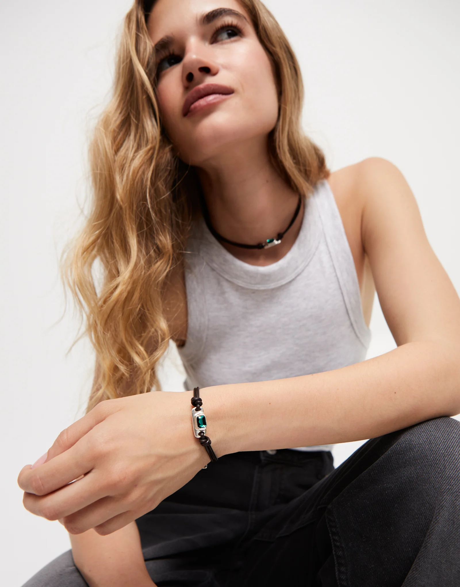 Esta pulsera de cuero negro combina la sobriedad del diseño minimalista con el impacto visual del cristal verde talla esmeralda incrustado en una pieza central bañada en plata.