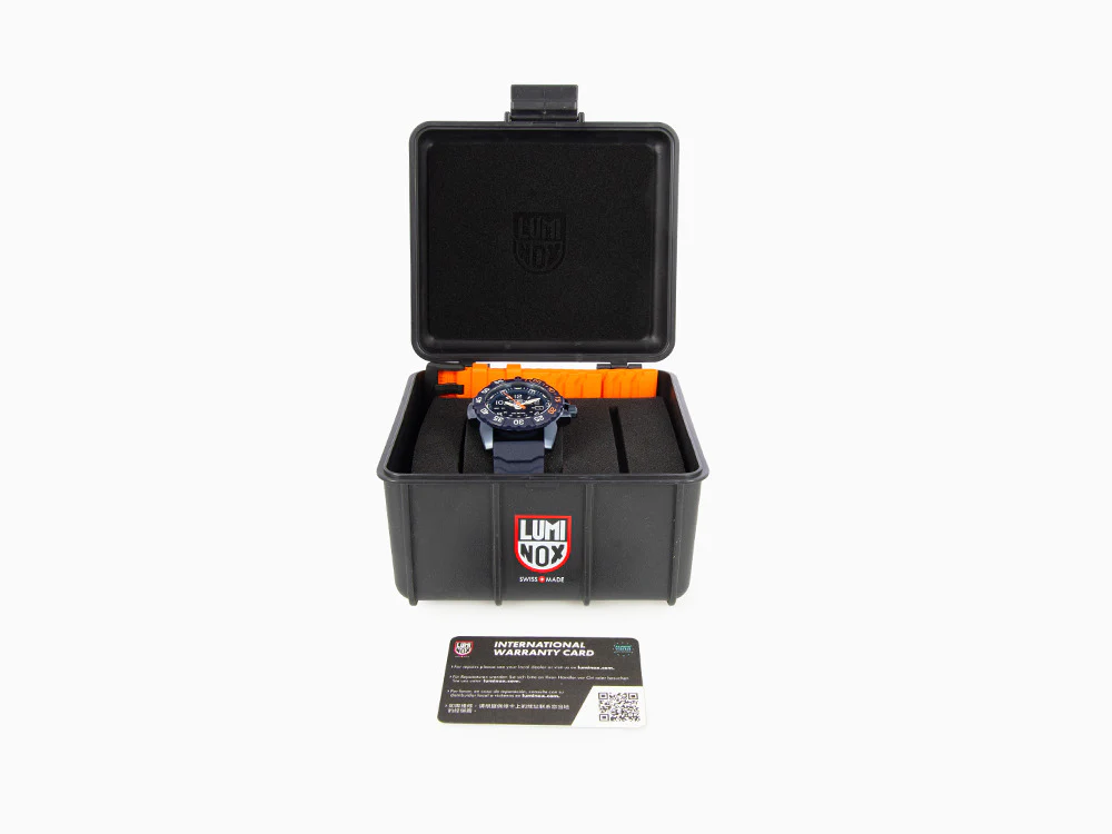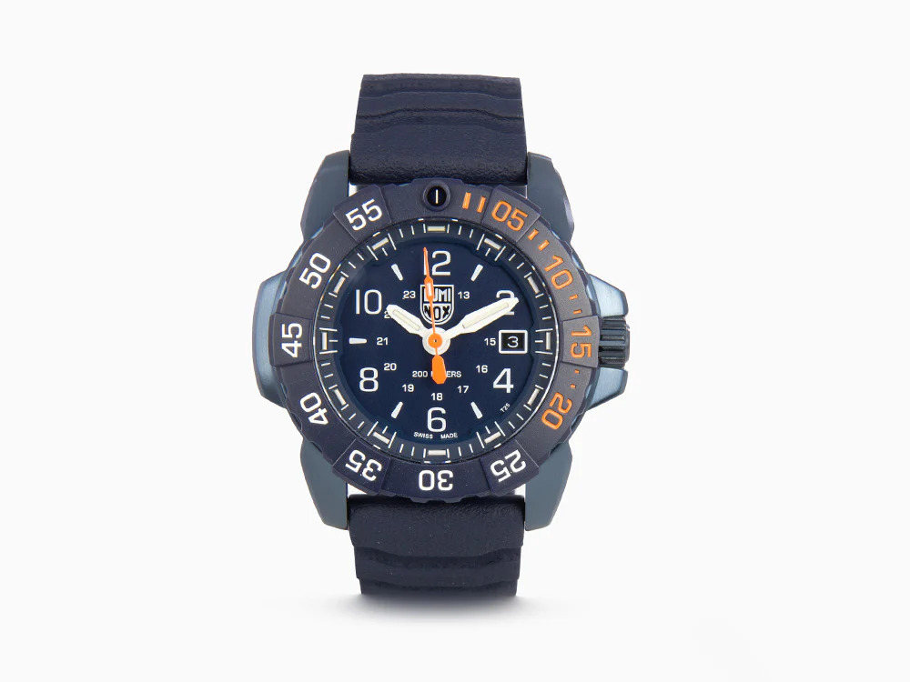 - Luminox Navy SEAL Foundation 3250 ‘Back To The Blue’ celebra el regreso de las operaciones de los Navy SEAL a sus orígenes acuáticos tras dos décadas dominadas por las misiones en tierra y el desierto. El reloj presenta una caja de acero inoxidable de 45 mm con revestimiento IP azul y un bisel giratorio unidireccional compuesto de fibra azul con números y marcadores naranjas de las 12 a las 4 horas. Se completa con una correa de caucho naranja impermeable. El uso del azul y el naranja en la correa y en los números del bisel es un guiño a la combinación de colores del rescate y la seguridad marítimos internacionales. El logotipo de la Navy SEAL Foundation está grabado en azul IP en el fondo de la caja de acero inoxidable atornillado para aumentar la resistencia al agua. Con hasta 20 ATM, 16 tubos Luminox Light Technology y un movimiento de cuarzo suizo, este reloj no sólo es elegante para el uso diario, sino también un compañero fiable en cualquier entorno sobre o bajo el agua.