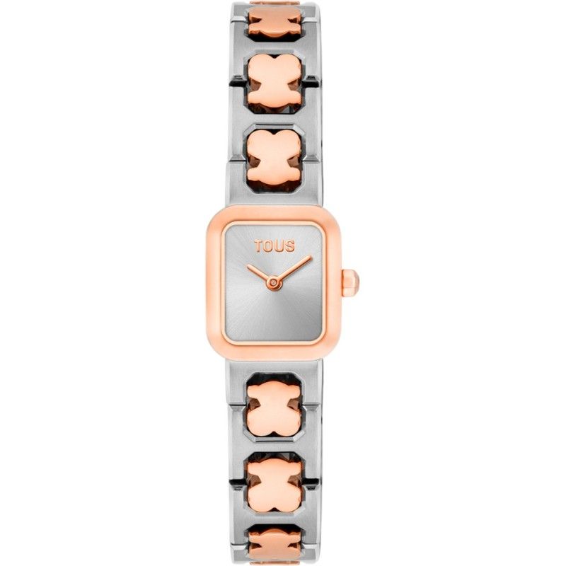 Reloj TOUS Watches para mujer de la colección Icon Time fabricado en acero inoxidable plateado y rosado. Estamos ante un atractivo reloj de diseño minimalista compuesto por caja cuadrada de 21,7 mm x 16,2 mm con bisel rosado con esfera plateada y agujas en dorado movidas por mecanismo de cuarzo analógico. Todo ello protegido por cristal mineral. Su brazalete lo forman eslabones plateados con ositos rosados y cierre desplegable mediante doble pulsador. Resistente al agua hasta 3 ATM.